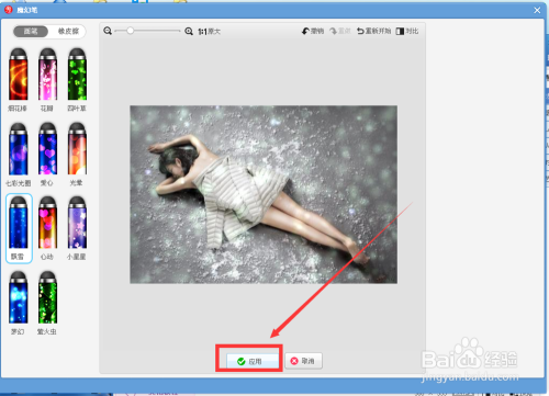 在梦幻笔页面,我们选择最后一个“飘雪”来单击,在图片编纂窗口肆意位置点击。每点击一次鼠标,画面飘雪数目就响应增添一点。