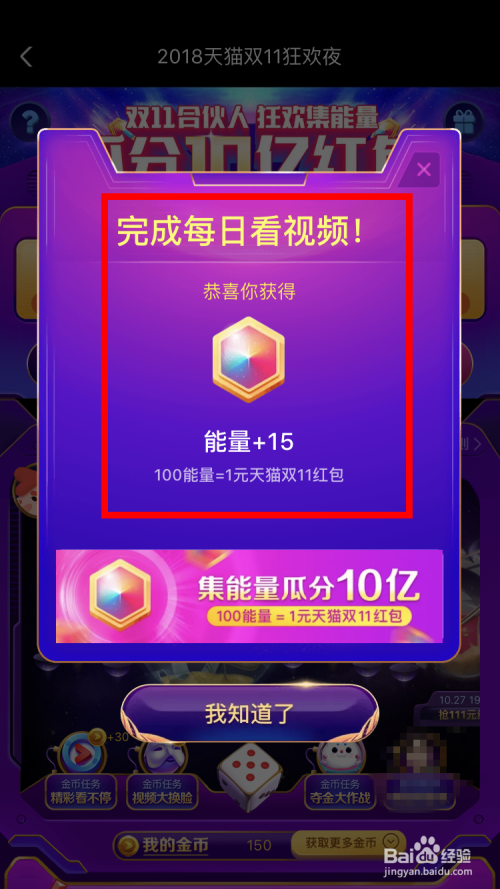 看完视频后,回到活动页面,就会当即弹出对话框。小编获得了15能量。