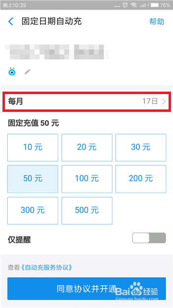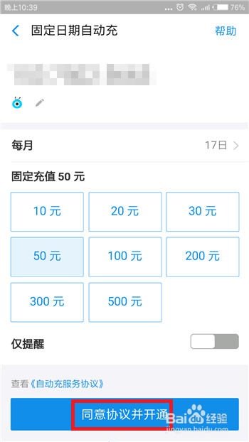 选择好每月主动充值的日期后,接下来就需要选择金额了,选择好金额后点击底部的【赞成和谈并开通】选项。