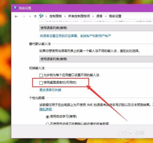 接下来,在打开的页面中我们会看到“利用桌面说话栏”复选框未被勾选,点击将该说话栏勾选,并点击保留按钮确定对Win10系统中的设置。