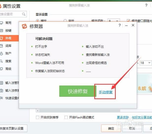 在搜狗输入法办理器页面中,点击选择“手动修复”选项,即可进入输入法手动修复页面。