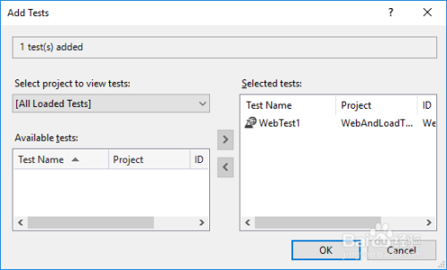在“可用测试”下,选择“WebTest1”,然后选择标的目的右键将其移动到“选定的测试”框中。 选择“确定” 按钮,如下图所示:
