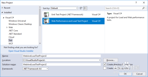 “新建项目” 对话框随即打开,在“新建项目”对话框中,依次睁开“已安装”、“Visual C#”,然后选择“测试”类别。 选择“Web 机能和负载测试项目”模板,如下图所示: