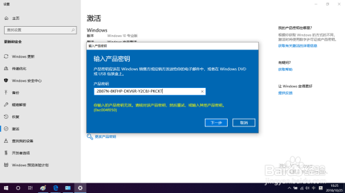 打开了输入产物密钥窗口,此时你复制的产物密钥输入栏中。过点击下一步按钮是否验证经由过程,若是没有经由过程改换产物密钥。在这我没有经由过程只能从头在网上找产物密钥从头改换产物密钥。