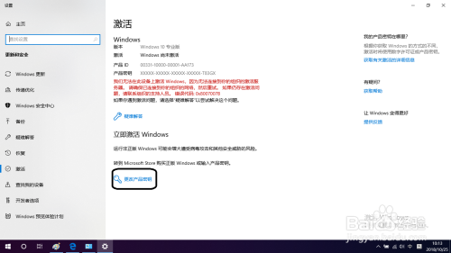 打开了Windows激活窗口,可看到系统的版本和产物密钥有用状况还未激活,在窗口中点击更改产物密钥。