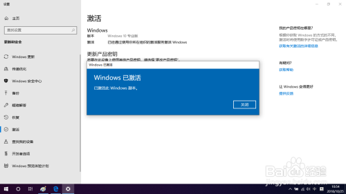 此时弹出Windows已激活小窗口申明当作功激活了,然后在窗口中点击封闭按钮。