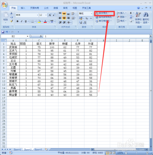 选中B2:G16单位格区域后,单击“样式”菜单中的“前提格局”