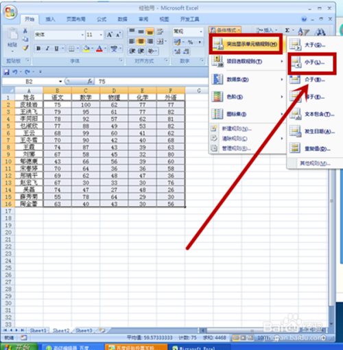 反复步调2,在弹出的“前提格局”对话框中,在“凸起显示单位格法则”栏下面选择“小于”