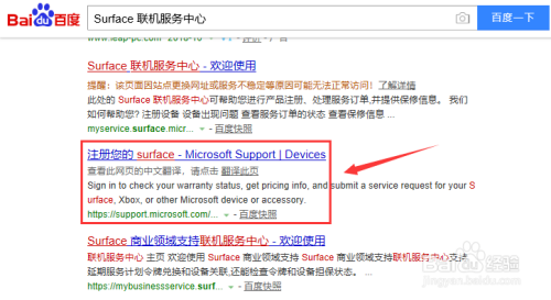 官网也可以查询,可是你必需先注册设备,百度搜刮Surface 联机办事中间,点击下图这个网址,前面满是告白。如下图所示