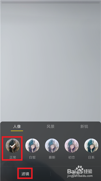 打开美化界面后可以看到有【滤镜】和【美颜】两个选项,在滤镜选项的上方有良多的类别,我们先利用【正常】的滤镜,这时辰根基是原色。