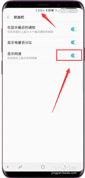 再状况栏设置界面,将网速后面的开关打开,这是在状况栏就可以看到网速了,如下图所示