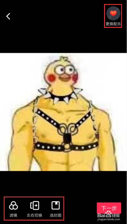 设置好合适的配乐、滤镜、切换模式、封面等,点击下一步。