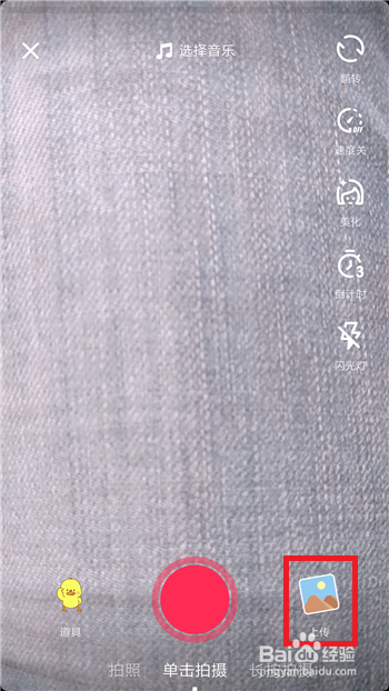 下载完当作后打开抖音,在抖音中点击进入到【录制】界面,然后点击右下角的【上传】选项。