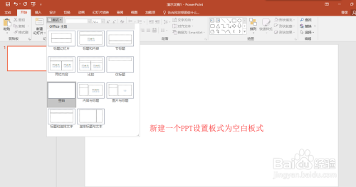打开PPT演示文稿,新建一个空白的演示文稿PPT文件,然后在开始菜单下找到板式号令,在板式中选择空白板式,单击空白板式应用。