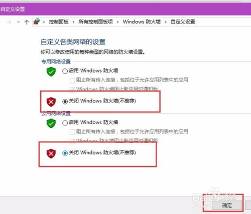 接下来,无论是公用或者是专用收集防火墙,建议大师都将其封闭,然后点击页面底端的“确定”按钮,保留对Windows防火墙的设置更改。