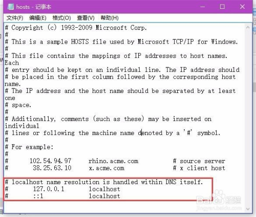 利用记事本体例打开该文件之后,请大师细心查抄一下该页面中是否存在被添加了和微软Windows更新有关的IP地址,若是有的话,请大师实时删除,正常的Hosts文件设置和下面的示例图是根基一致的。