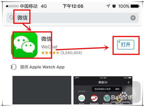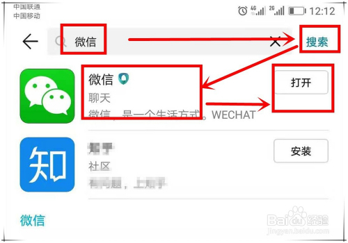 在打开的应用市场窗口中,点击搜刮栏,输入“微信”做为关头字进行搜刮,然后点击搜刮到的微信后的“安装”按钮,即可下载微信并主动进行安装。因为小编手机上已经安装好了微信,所以只能看到“打开”按钮。