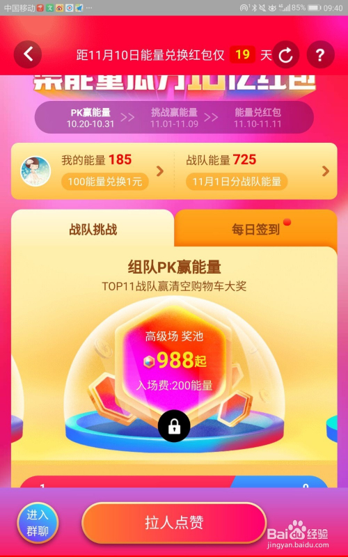 方式四:组队挑战分能量。组织老友,构成战队,进入“奖池”,获得能量,不外有的奖池,需要付入场费,也就是付能量才能进入,好比“中级场奖池”,“高级场奖池”等。