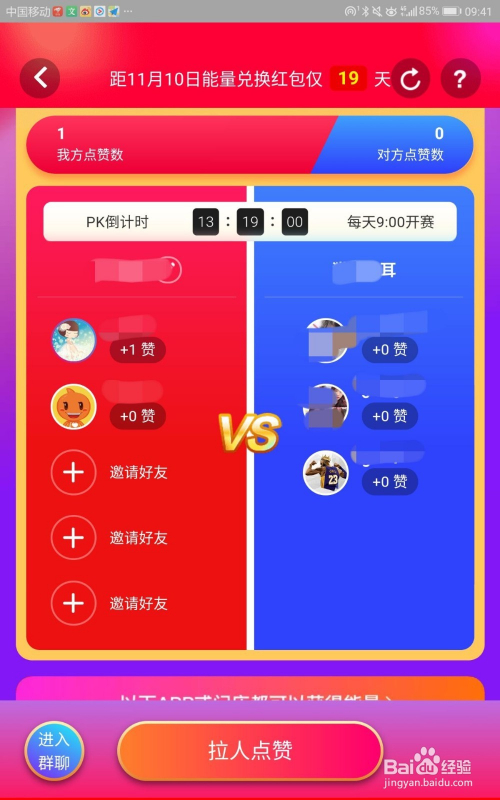 方式六:组队PK赢能量。我们可以选择构成本身的集能量PK战队,再选择一个你想与之PK的战队进行两队之间的PK,获胜的一方可以在第二天获得不定量的战队能量奖励。