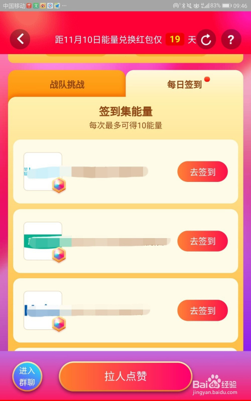 方式三:每日签到。我们可以在页面中点击“战队能量”下方的“每日签到”,签到一个店肆是10能量。