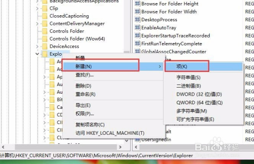 接下来,我们我们在打开的Explorer子项中击右键,然后在弹出的右键菜单中选择“新建-项”选项。