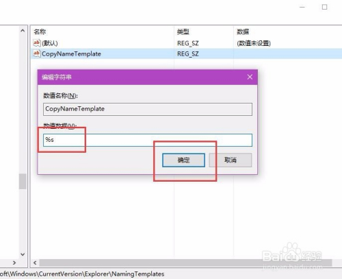 接下来,我们双击打开新成立的CopyNameTemplate子项,然后将其键值点窜为“%s”,然后点击确定按钮保留对该注册表的更改。