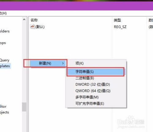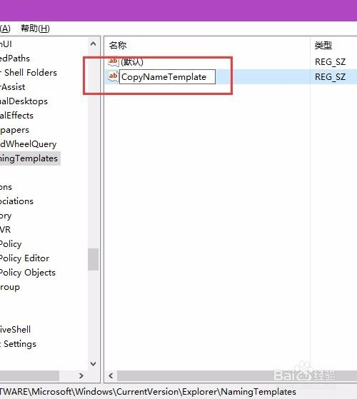 接下来,我们只需要打开新成立的NamingTemplates子项,在页面右侧空白处,选择“新建-字符串值”选项,然后将新成立的字符串值定名为“CopyNameTemplate”。