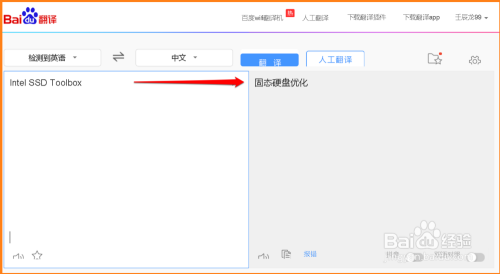 我们可以先在百度翻译中查询 Intel SSD Toolbox 的中文名称,经由过程查询,可知Intel SSD Toolbox的中文名称为:固态硬盘优化;