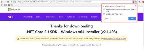 点击Windows版本下的 Download .NET Core SDK ,浏览器可能会阻止文件下载,如下是谷歌浏览器,如下图所示: