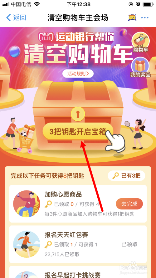 如许进入了活动页面。在活动页面里面有个年夜宝箱,需要3把钥匙才能开启。获得钥匙的方式掉去做使命。