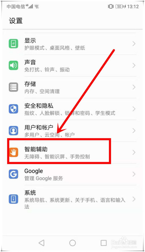 在“设置”页面,找到“智能辅助”选项,该选项中可以设置“无障碍”、“智能识屏”、“手势节制”等功能,点击进入。