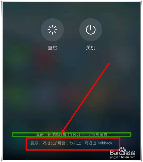 若是要退出TalkBack模式,可以长按手机电源键,当屏幕呈现“关机”、“重启”提醒时,按照下方提醒:双指长按屏幕3秒以上,可退出TalkBack。在该界面长进行操作,就可以直接退出TalkBack模式了。