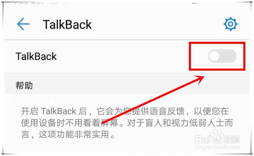 点击TalkBack后的开关,即可开启“TalkBack”功能。开启TalkBack功能后,它会为手机操作供给语音反馈,既便你不看屏幕也能利用手机,该功能对于瞽者和目力低弱人士而言,很是适用。