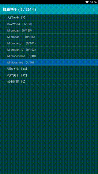 推箱快手,有一个关卡集,Minicosmos,里面的关卡,年夜体上为每三个一组,别离为1个箱子、2个箱子、3个箱子,而且是由简入难的摆列。