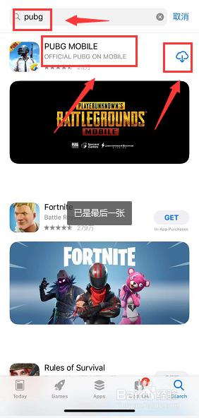 搜索框输入pubg,成果中点击pubg mobile即可下载了,如下图所示
