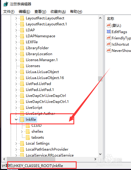 打开注册表编纂器今后,依次双击打开左侧栏目,然后将文件定位到: HKEY_CLASSES_ROOT\lnkfile文件夹目次。