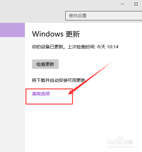 接下来,点击Win10系统更新页面中的第一项“Windows更新”选项,然后在弹出的菜单中选择“高级选项”菜单。