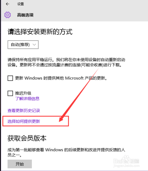 进入Win10高级菜单选项设置页面今后,在页面中点击选择“选择如何供给更新”按钮,在该选项中可以对Windows更新进行设置,选择如何进行更新。