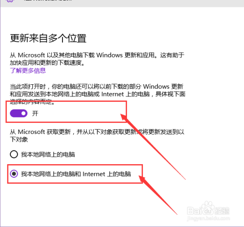 打开该选项设置页面今后,我们可以看到系统默认利用微软办事器和P2P通道进行更新,在更新的过程中还会利用P2P通道进行数据的上传操作,年夜年夜华侈了我们的收集带宽。是以,为了节流收集带宽,建议大师封闭默认的更新开关,并将更新选择为“我当地上的电脑”即可,小伙伴们从速尝尝吧。