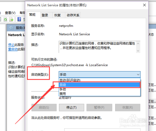 在Windows办事列表组件中,找到Network List Service办事之后,对着该办事击右键,选择“属性”选项。