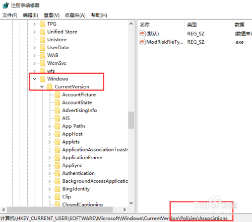 在接下来打开的注册表编纂器中,依次双击打开左侧“HKEY_CURRENT_USER\Software\Microsoft\Windows\CurrentVersion\Policies\Associations”目次。