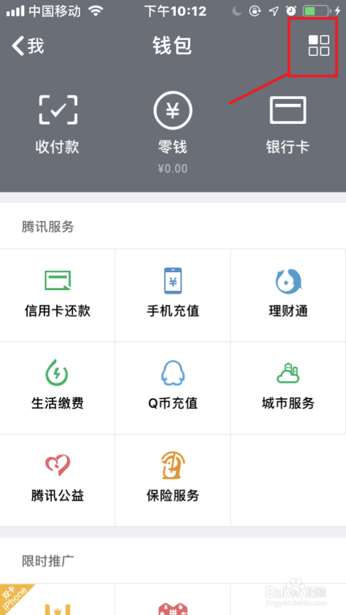 点击右上角“四个小方框”图标,进入“钱包付出中间”设置。