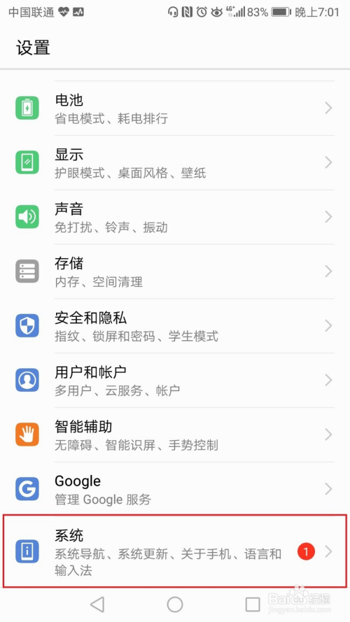 标的目的下滑动设置页面,点击“系统”按钮;