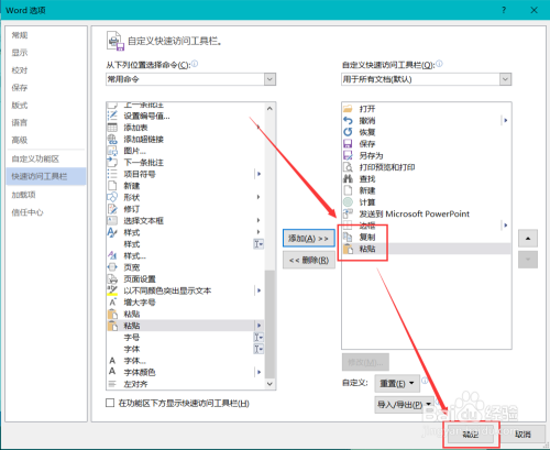 在“常用号令”下,把“复制”“粘贴”号令添加到“自界说快速拜候东西栏”,点击确定。