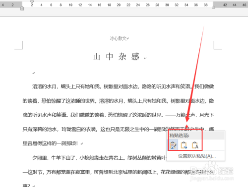 把光标插入到筹办粘贴的位置,右键单击,选中快捷菜单中的“粘贴”,可执行“保留源格局”“归并格局”“只保留文本”。