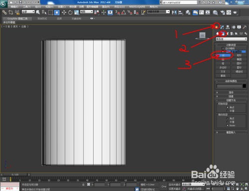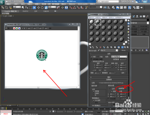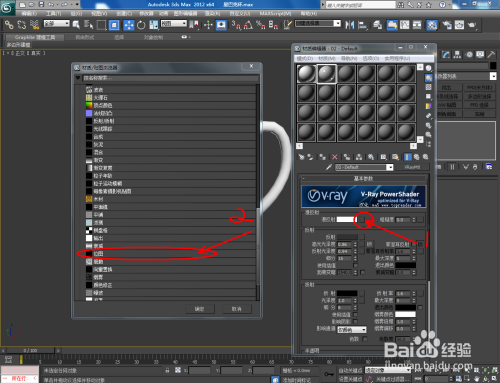 点击【材质编纂器】,弹出材质编纂器设置框。按图示设置一个陶瓷材质球,并附加一个位图。将材质球附加给杯子后,点击【UVW贴图】,选择柱体,设好参数(如图所示);
