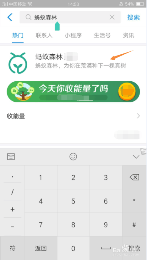 若是你把蚂蚁丛林做了设置,那么你可以在首页上找到,你也可以点击首页上方的搜刮,搜刮蚂蚁丛林,软件会直接弹出搜刮成果。