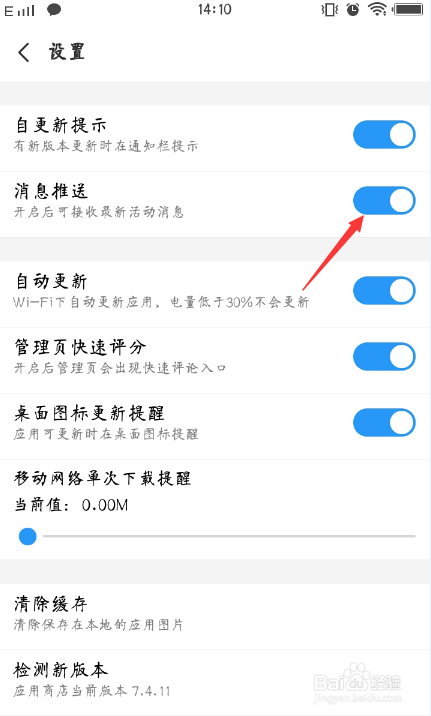 在动静推送(开启后可接收最新活动动静)后面有个蓝色按钮,默认打开状况。要打消接收动静,就把后面的按钮封闭。