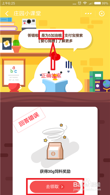 可以看到系统提醒小编回覆错误,可是在上方已经提醒了我们准确谜底,所以列位小伙伴万万别选错了,如许点击【去领取】仍然可以获得奖励。