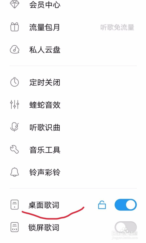 打开酷狗设置,点击找到桌面歌词,灰色是显示封闭。蓝色是显示打开了。